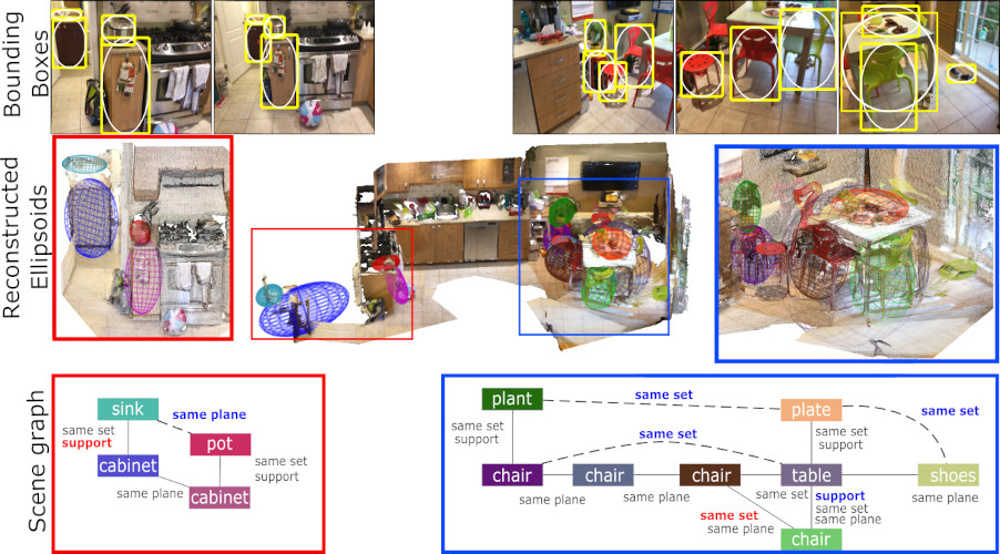 With sensory inputs of different modalities including visual, audio and range, etc..., PAVIS develops algorithms that are able to digitalize and model the physical world either in a dense manner as point clouds or in a compact manner as scene graphs with spatial semantics. We believe for a complete scene understanding, the scene representation should encode not only the geometrical attributes, but also scene semantics in its static or dynamic form, which empowers any AI system with answers to queries, such as ‘where are things? what are their functions? and what are the dynamics of the scene?’.