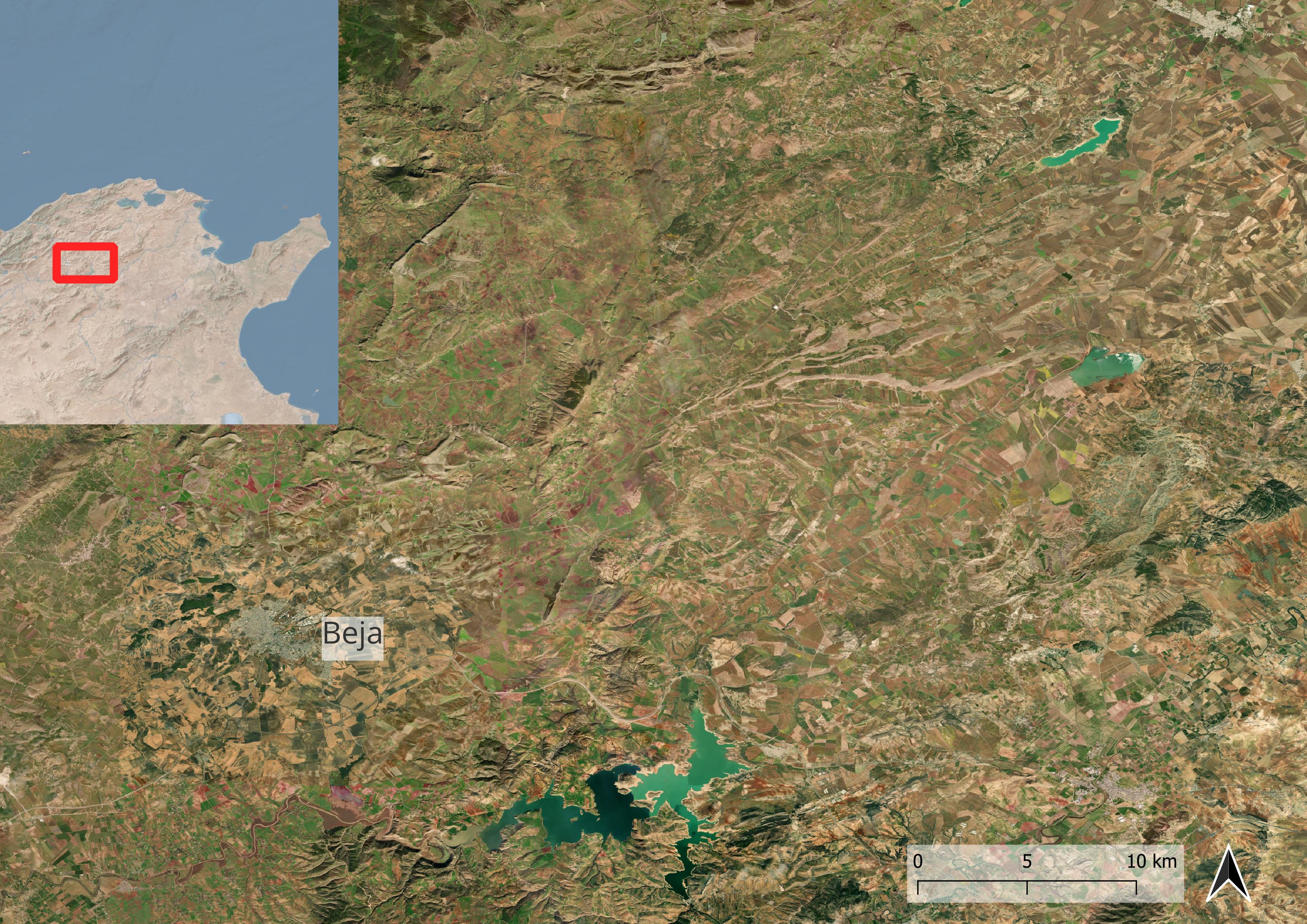 The area is part of the governorate of Beja, in the northwest of Tunisia. It includes the Roman cities of Vaga (Beja), Belalis Major, and many settlements and rural centres, spanning from the 4th century AD to the Late Antiquity (8th century AD). Traces of buried infrastructures are visible on satellite imagery (roads and centuriations), together with late Roman fortresses, churches and other archaeological structures. Illicit excavation activities (looting) are also detectable in major archaeological sites.