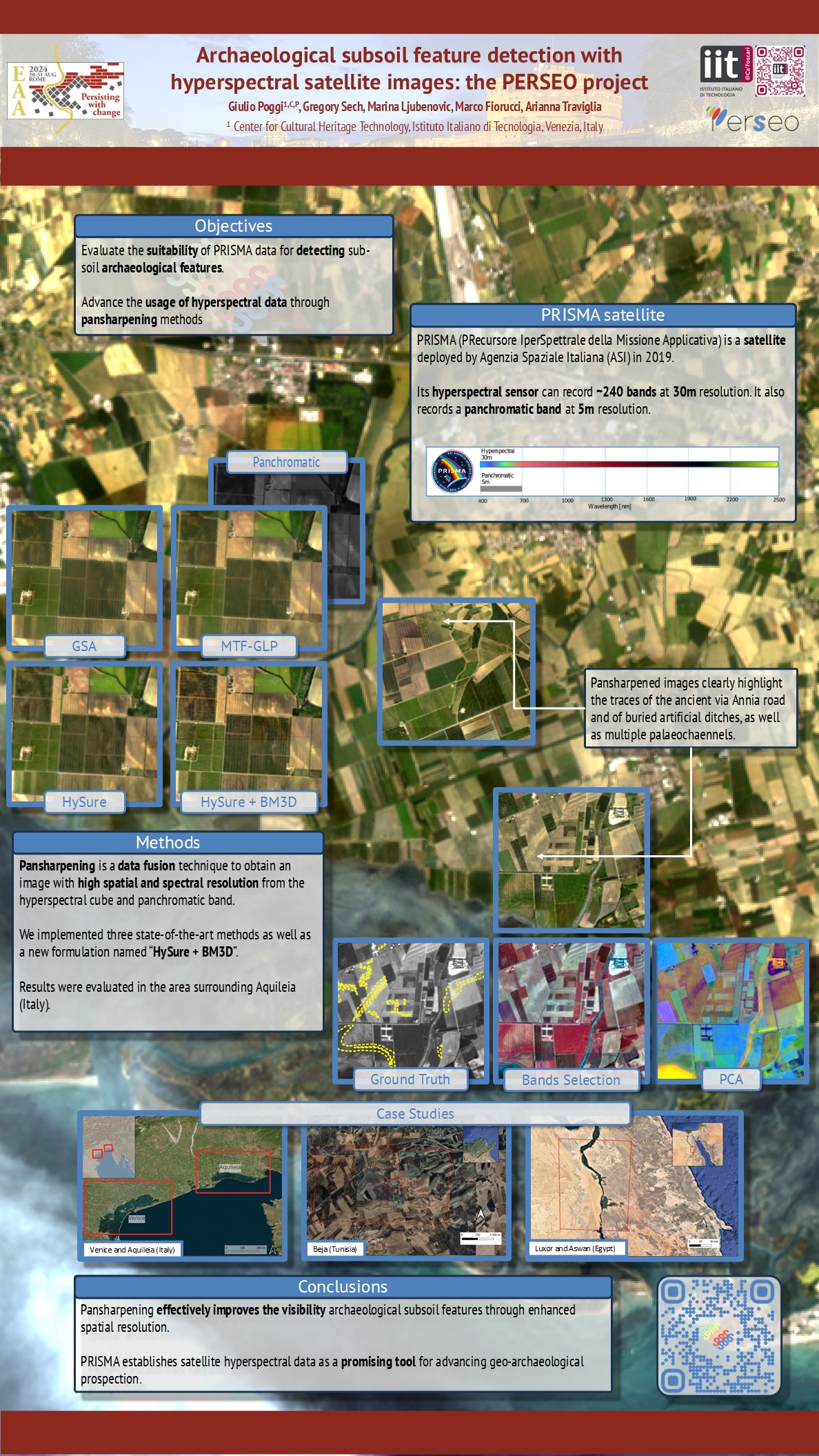 At the 30th Annual Meeting of the European Association of Archaeologists (EAA), held from August 28 to 31, 2024, at Sapienza University in Rome, we presented a poster on the application of PRISMA pansharpening techniques for enhancing the detection of archaeological traces.
