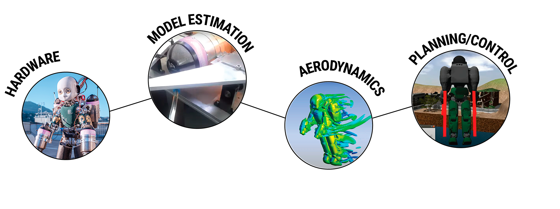 To efficiently test our flight control and planner during actual robot experiments, we need to conduct research activities to model and identify the jet turbines. For this reason, we have developed a sophisticated test bench for determining the input/output relationship of the jet engines. Thrust estimation and control are implemented based on the identified turbine models and feedback data from the turbines, such as the Round Per Minute (RPM) and the pump voltage. We also aim to include robot sensors and models in our estimation algorithm to improve thrust estimation during flight further.