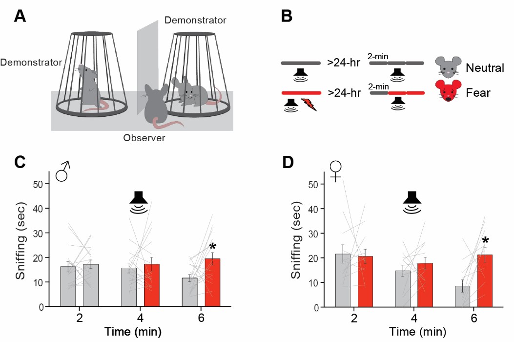 Fear Emotion Discrimination test for mice. (A) Schematic drawing of the test setting. (B) Timeline of pre-test and test procedures to evoke in one of the demonstrators a ‘‘fear’’ state by delivering the conditioned tone in the 2- to 4-min epoch. (C and D) Time (in seconds) spent sniffing demonstrators in neutral (gray bars) or tone-induced fear (red bars) state displayed by (C) male and (D) female observer mice during the 6-min test, divided into three consecutive 2-min epochs. *p < 0.05 versus the exploration of the neutral demonstrator. n = 8/15 observers per group. Modified from Ferretti et al Current Biology 2019.