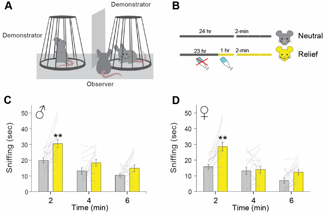 Relief Emotion Discrimination test for mice. (A) Schematic drawing of the test setting. (B) Timeline of pre-test and test procedures to evoke in one of the two demonstrators a ‘‘relief’’ state during the testing phase. (C and D) Time (in seconds) spent sniffing demonstrators in neutral (gray bars) or water-induced relief (yellow bars) states displayed by (C) male and (D) female observer mice during the 6 min of the test, divided into three consecutive 2-min epochs. **p < 0.005 versus the exploration of the neutral demonstrator. n=15 observers per group. Modified from Ferretti et al Current Biology 2019.