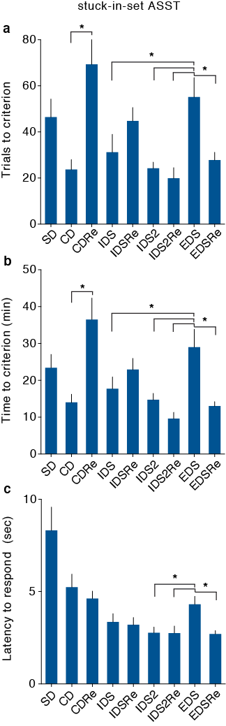 The novel two-chamber intra-/extradimensional Operon task reliably measures attentional set shifting abilities in mice. (A) Trials and (B) time (in minutes) needed to reach the criterion in the different stages of the intra/extradimensional Operon task. (C) Time (in seconds) elapsed between the opening of the divider door and a nose-poke response (latency to respond) during the different stages of the task. Twenty-six mice were tested; four mice were excluded because they were not reliably poking to retrieve the food reinforcement during the training or were not able to finish the entire procedure. All other mice readily learned to poke in the holes for food rewards and were able to perform the multiple sequences of discriminations. SD, simple discrimination; CD, compound discrimination; CDRe, compound discrimination reversal; IDS, intra-dimensional shift; IDSRe, intra-dimensional shift reversal; IDS2, intra-dimensional shift 2; IDS2Re, intra-dimensional shift 2 reversal; EDS, extra-dimensional shift; EDSRe, extra-dimensional shift reversal. Note that the mice were able to complete the entire task in 5–9 days. *p < 0.05. Values represent mean ± SEM. Modified from Scheggia et al., Biological Psychiatry 2014.