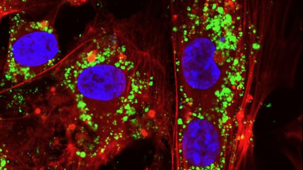 Photo: MIcrograpfh showing a few muscle cells cultured in simulated microgravity and treated with nanoceria. Cell nuclei are stained in blue (Hoechst), while actin filaments are marked in red (phalloidin). Internalized nanoparticles are presented in green.
